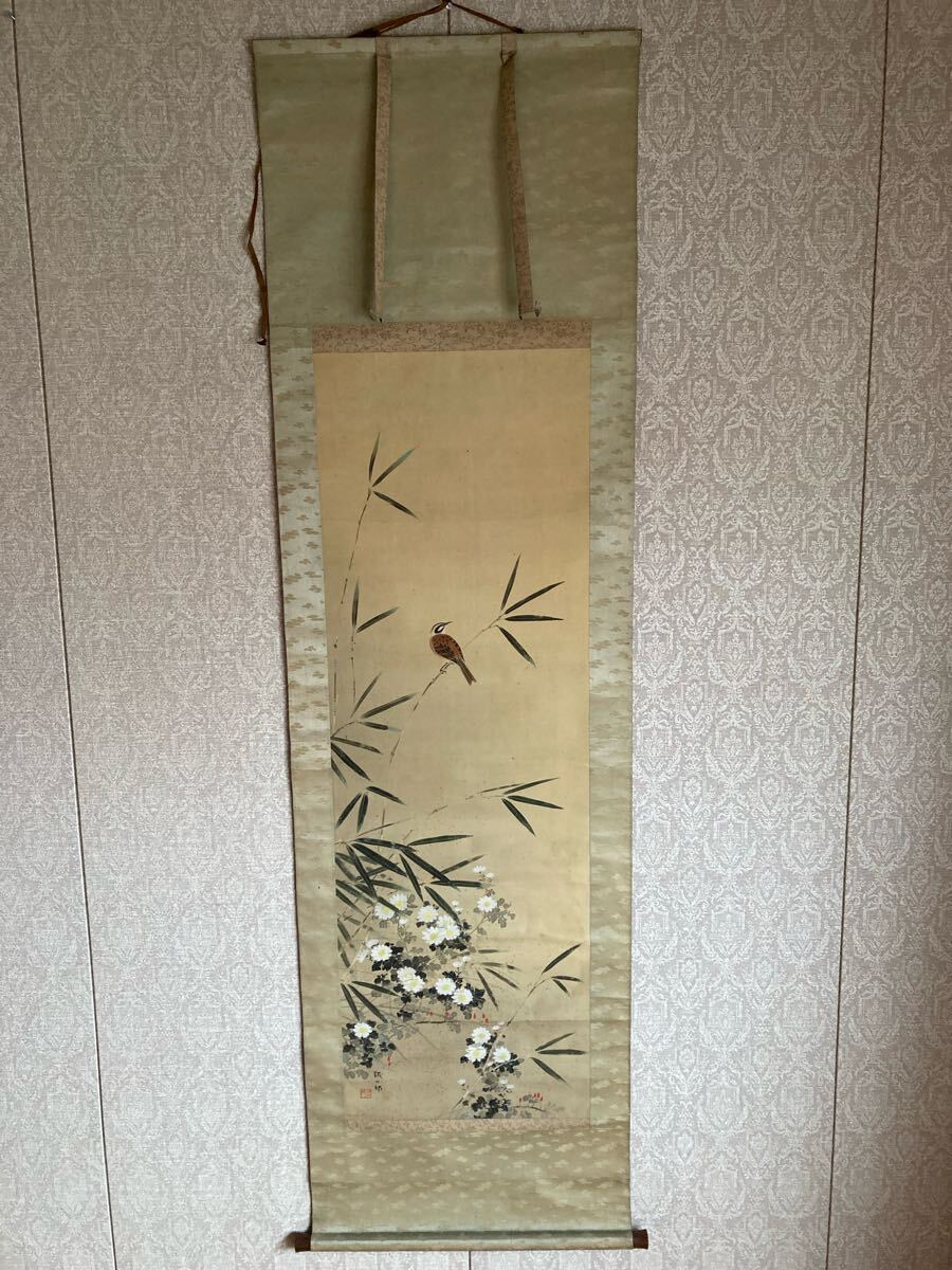 - 骨董品 掛軸 銘有【 誠四郎 】小キク 小菊 竹二雀 美術品 山水画 掛け軸 鳥 花鳥