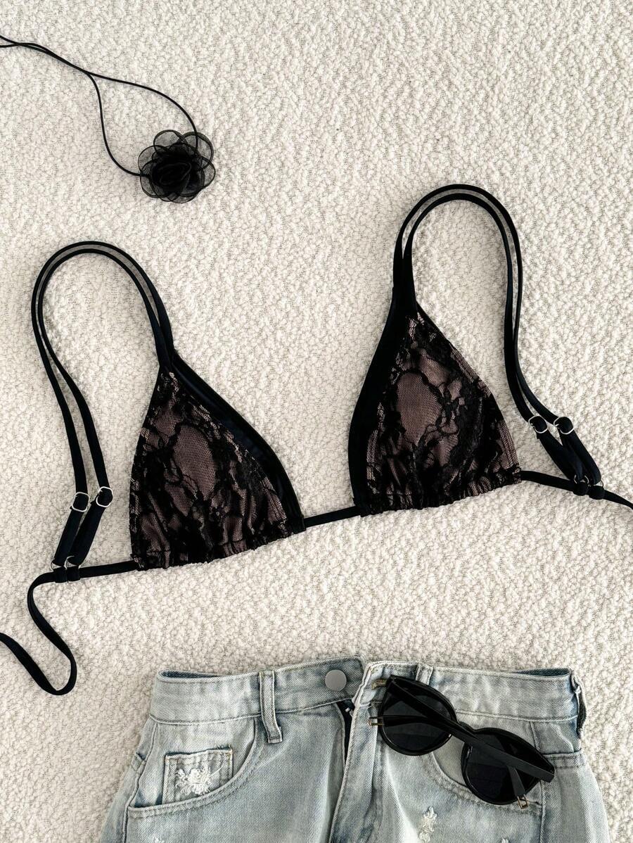 - レディース 水着 トップス 夏のビーチバケーション レディースセクシー ブラック レース ディープネック ビキニトップ
