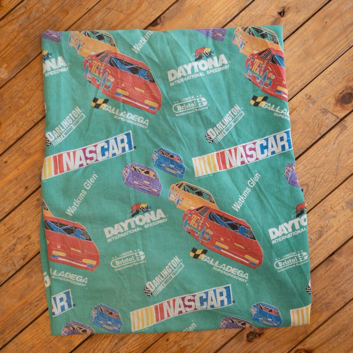 - USAヴィンテージ ベッドシーツ NASCAR ナスカー リメイク生地 素材 グリーン 車 スポーツカー ボックスシーツ アメリカ仕入 B2453