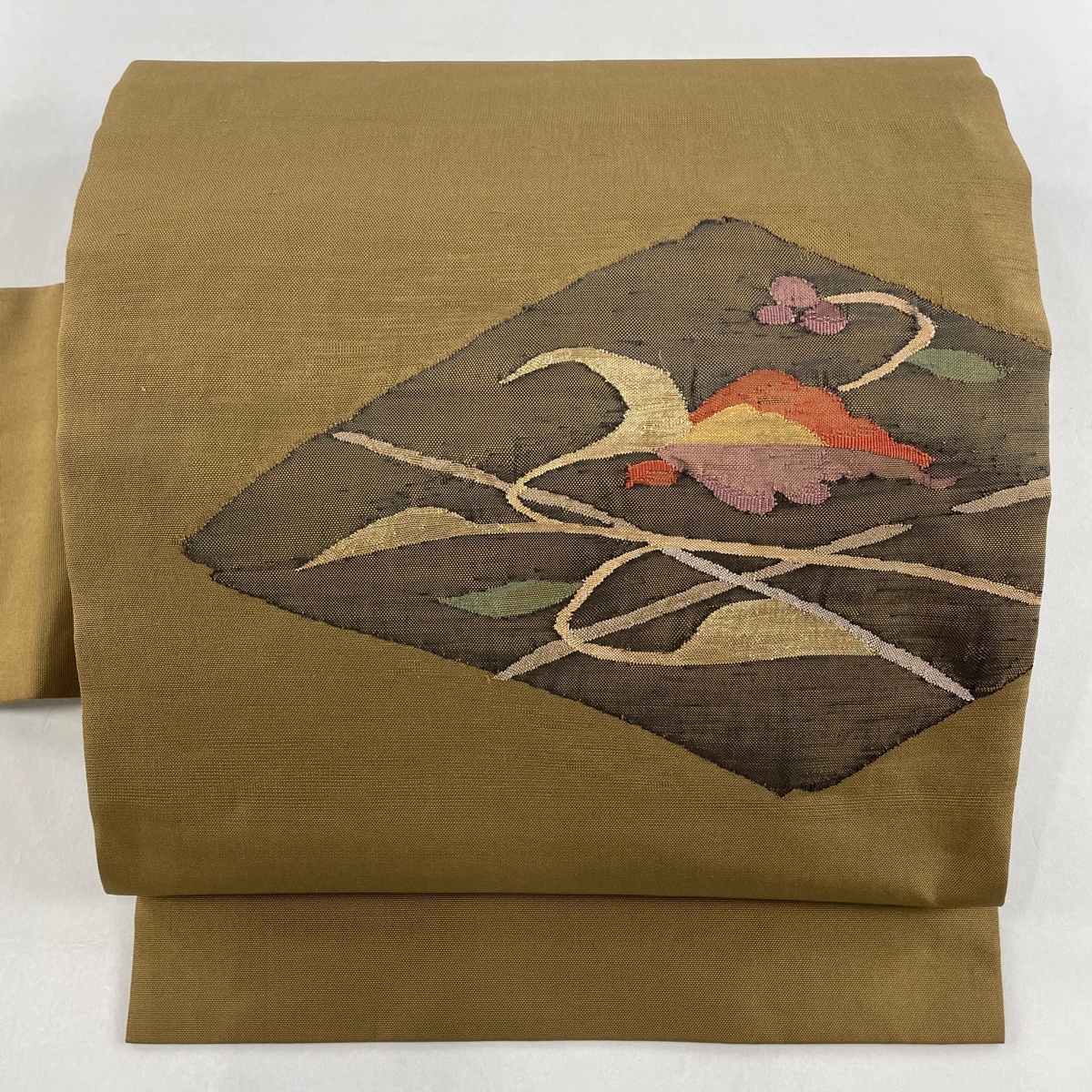 > 名古屋帯 美品 優品 菱 草婆 箔 茶緑色 正絹 【中古】
