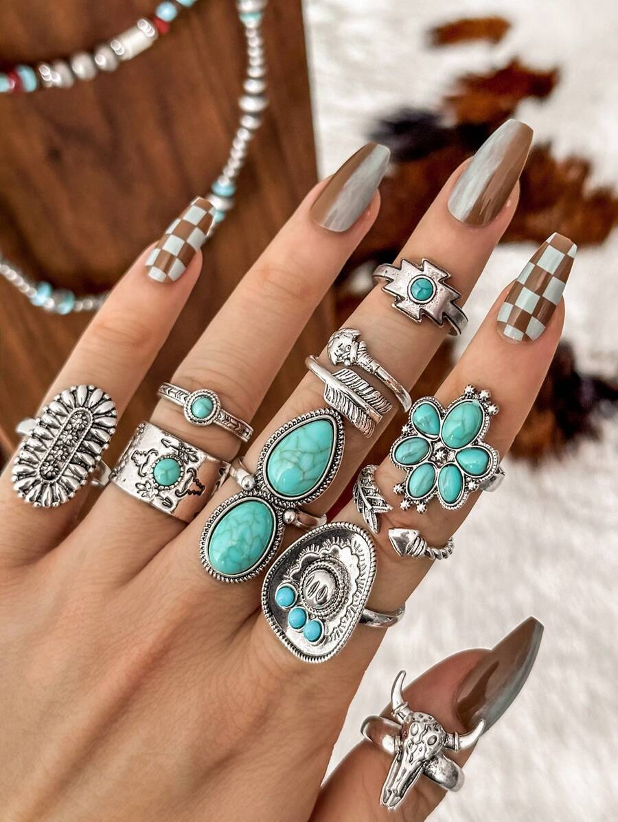 - リング レディース セット 10個セット ビンテージ調 ターコイズデザインオープンリング、テキサスマップ、サボテン、ひまわり、矢印