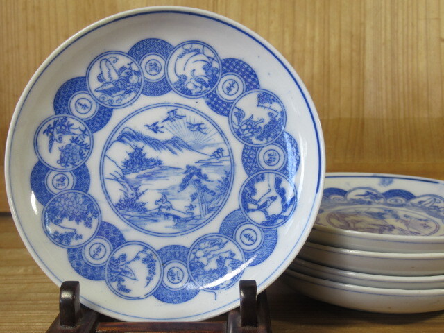 - ◆図変わり印判皿:1:◆『16丸紋:福寿:花鳥』◆見込み:山水:乗馬:釣り人◆明治期◆取り皿◆小皿◆5客◆