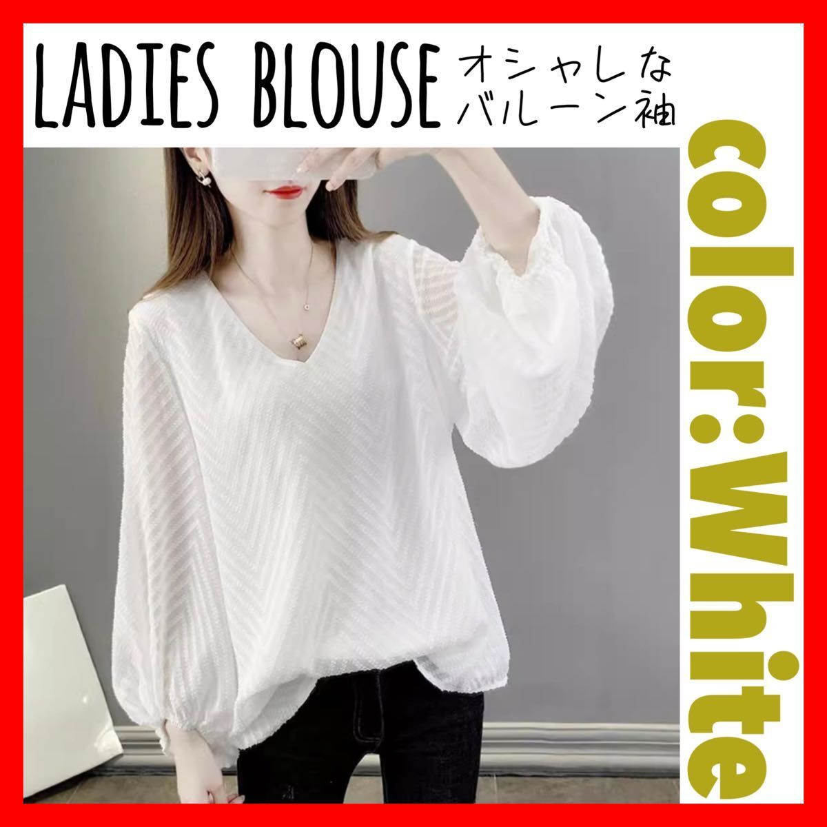 - ホワイト レディース ブラウス バルーン袖 ゆったり おしゃれ 長袖 トップス Vネック 通勤 体型カバー 5961
