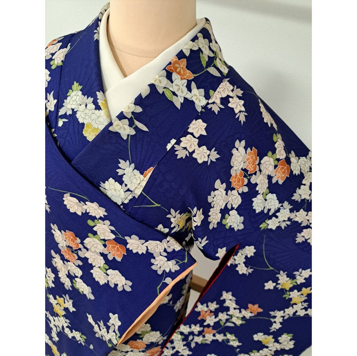 - 即決■着物の越田■裄62身丈155 正絹 アンティーク 袷 刺繍 橘 牡丹 檜扇の地紋 巣◇ふ12S02