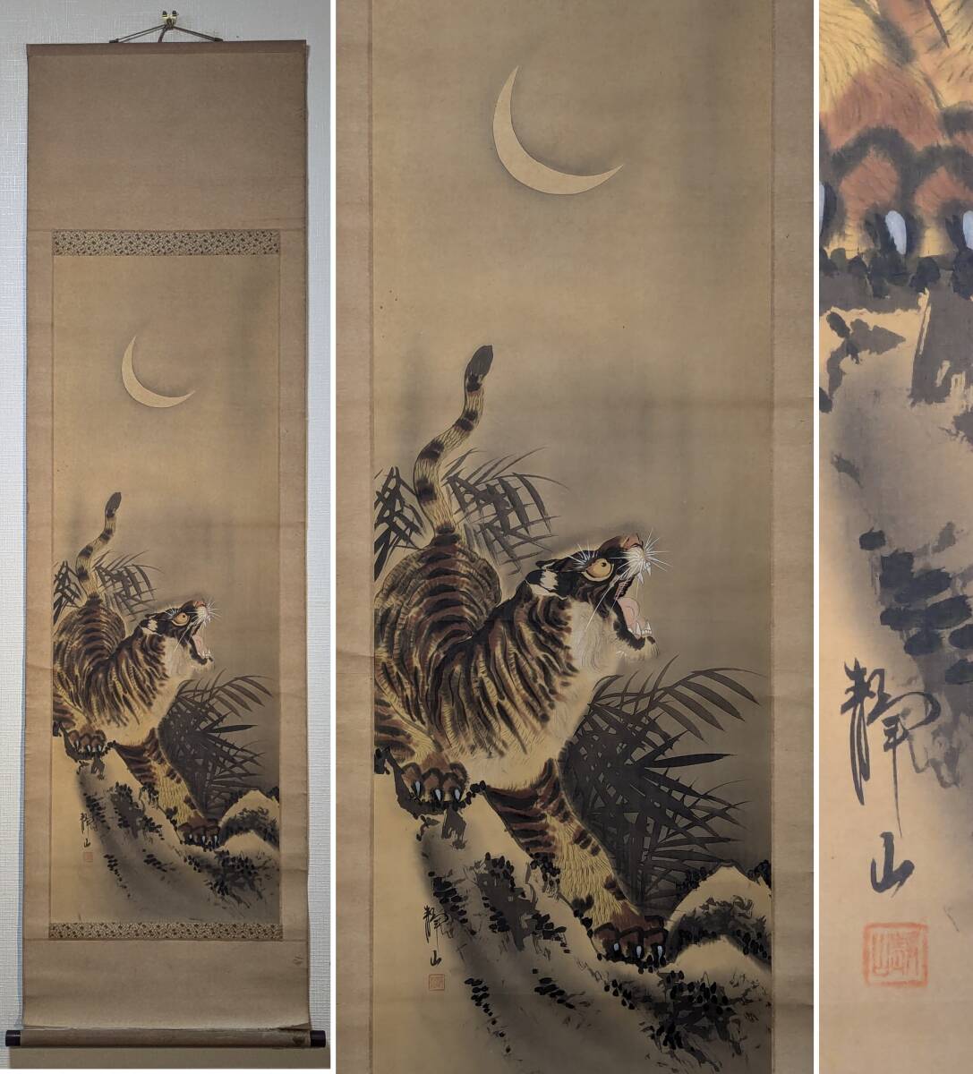 - 【真作】掛軸 猛虎図 三日月と咆哮する虎 気迫ある筆致と構図の逸品 R156