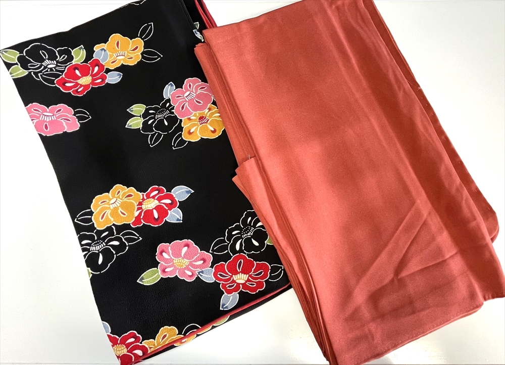 > 花とら●リサイクル着物 小紋 2枚まとめて 黒 ちりめん 椿 橙 鮫小紋 一つ紋付き 美品 250404