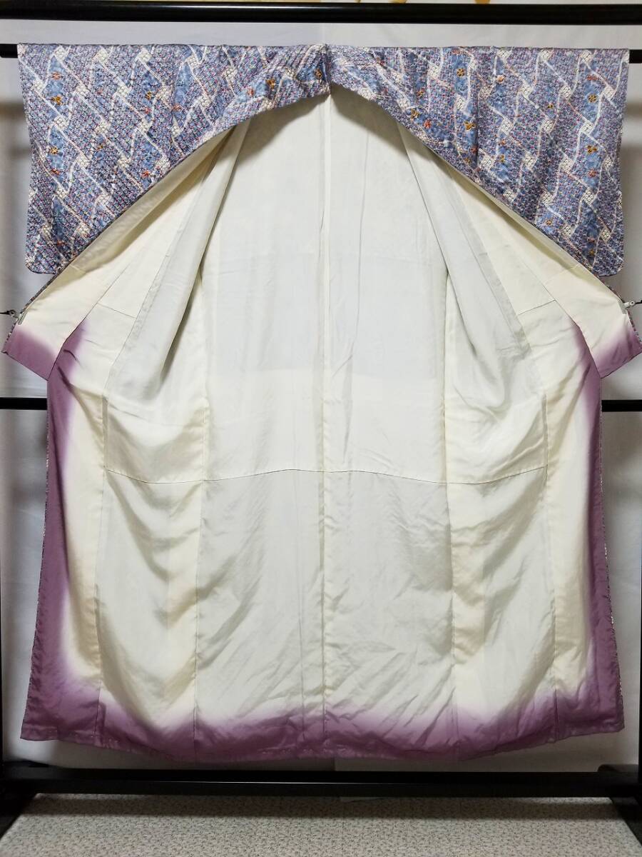 > 【桐輪】絞り小紋☆送料無料☆仕付け糸付{正絹*絞り*袷小紋}*身丈155-裄63*藍鼠色と白色の暈し染地*瓦文様の中に手絞りと唐絞り*№4357
