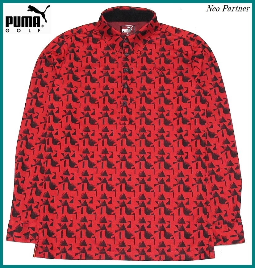 - 即決 極美品 PUMA GOLF プーマゴルフ 幾何学 総柄プリント 吸汗速乾 ストレッチ 長袖ポロシャツ レッド S メンズ