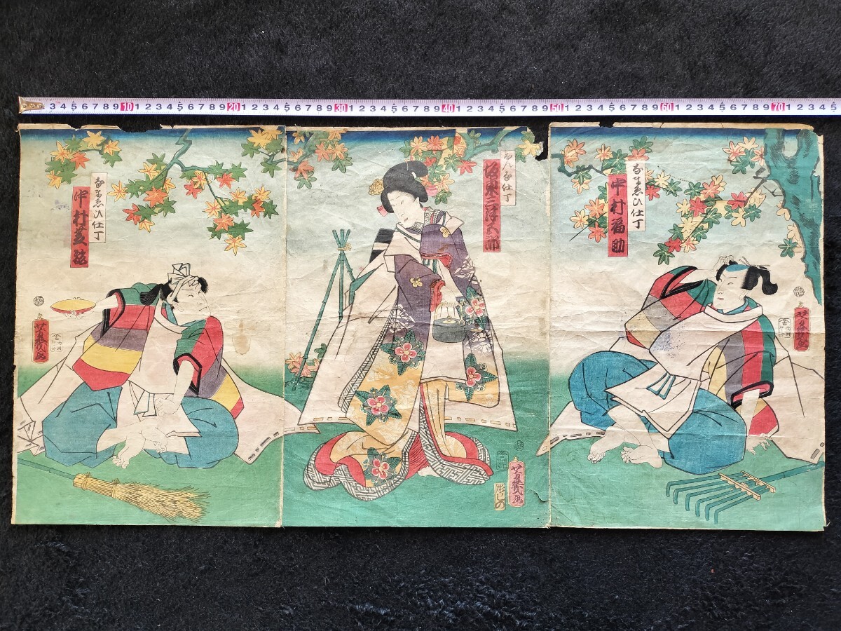 - 【真作】本物浮世絵木版画 落合芳幾「坂東三津五郎」江戸期 役者絵 三枚続 大判 錦絵 保存良い