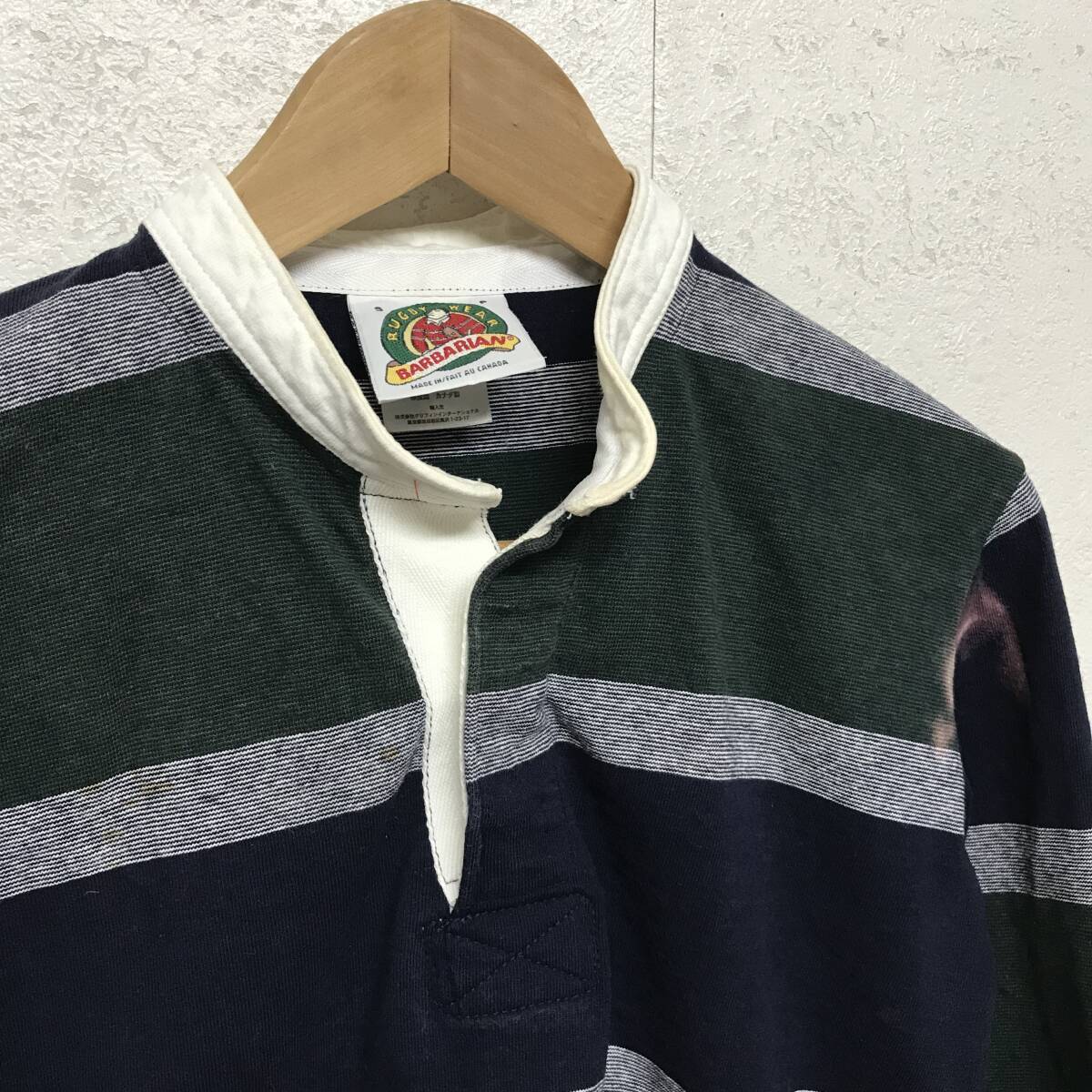 - FNY22/53 BARBARIAN スタンドカラー ラガーシャツ ネイビー/グリーン Sサイズ バーバリアン 長袖 カナダ製 ボーダー ※肩色抜けあり○