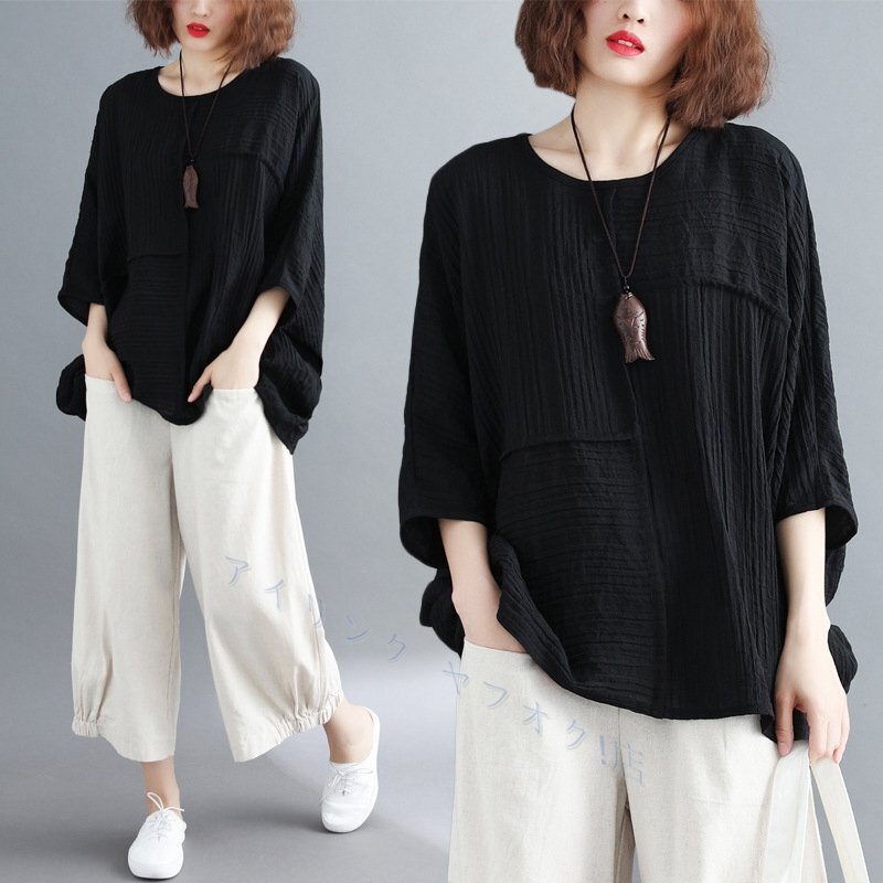 > お色選択可夏 ブラウス レディース 七分袖 カットソー チュニック クルーネック ドルマン トップス 薄手 無地 黒 Fサイズ