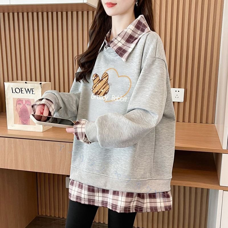 - 通勤トレーナー 薄手 長袖 レディース重ね着風 春秋 秋服 春服 トップス プルオーバー ゆったり チェック柄 オーバーサイズ2色M-2XL