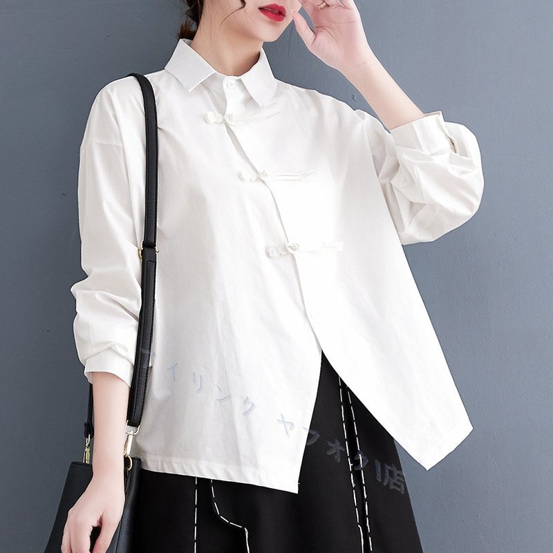 - レディース カジュアル ゆったり 大きいサイズ チャイナドレス風 不規則 長袖 シャツブラウス トップス 白L-2XLサイズ