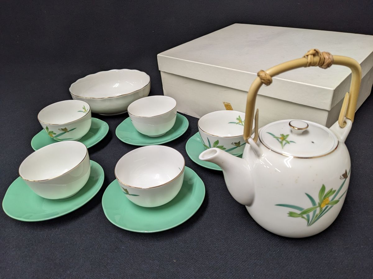 > Q518 弥生窯 花しらべ 菓子鉢付煎茶揃 蘭文 菓子鉢 急須 煎茶碗5客 茶托5客/100