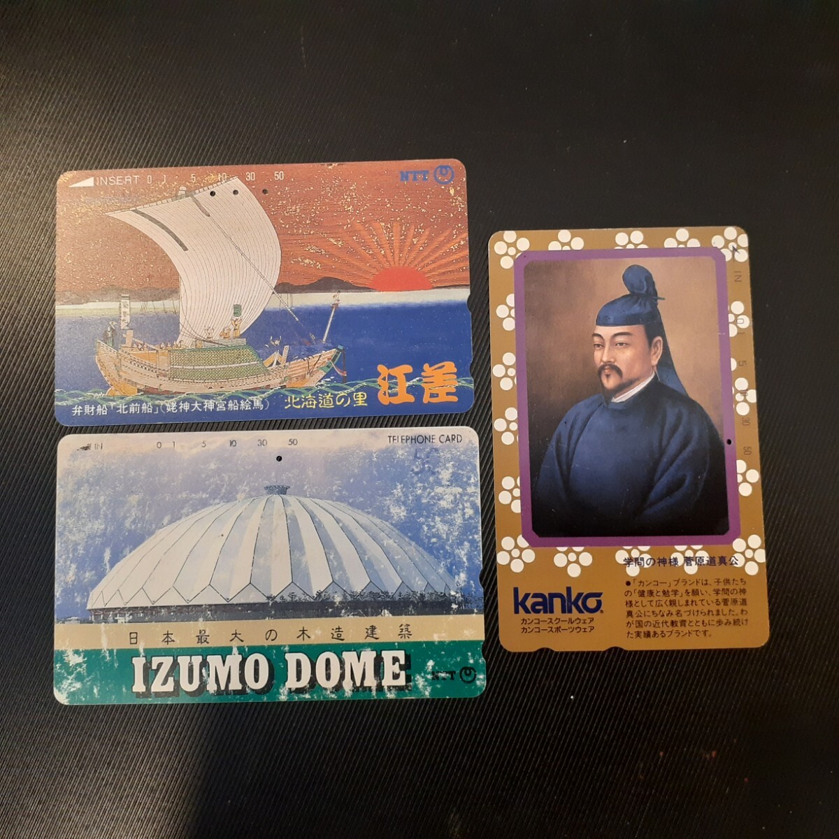 - 送料無料 テレカ 3枚セットで 北海道の里 江差 弁財船 北前船 学問の神様 菅原道真 日本最大の木造建築 出雲ドーム テレホンカード