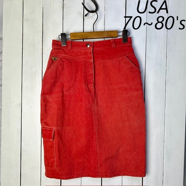 - USA古着 70s~80s 赤デニム カーゴスカート 12 S~M 膝丈 オールド ヴィンテージ アメリカ古着 TALON タイトスカート カラーデニム ●394