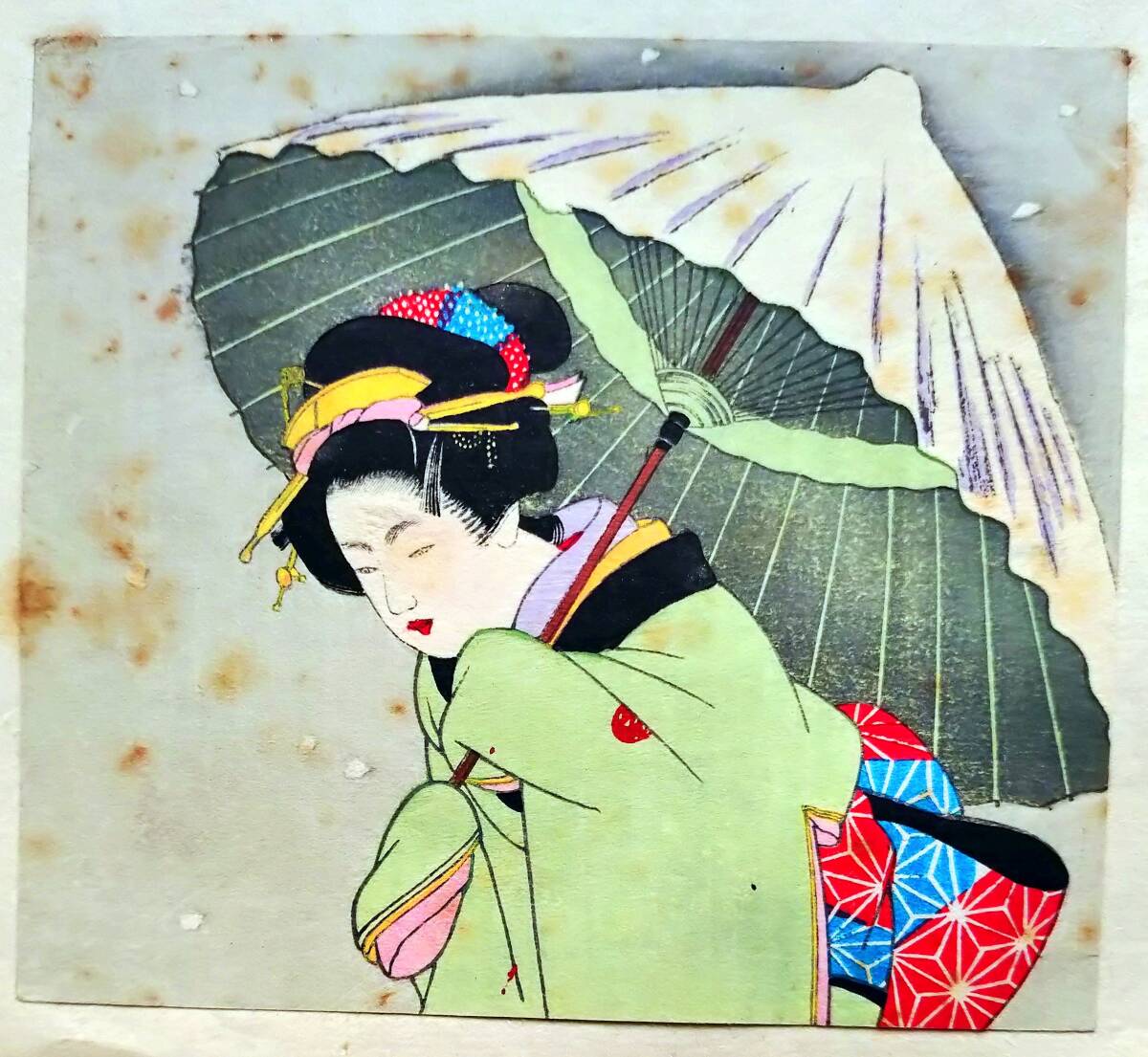 - f25042374〇彩色木版画 ハガキサイズ 雪と美女 錦絵 浮世絵 昭和年代〇和本古書古文書