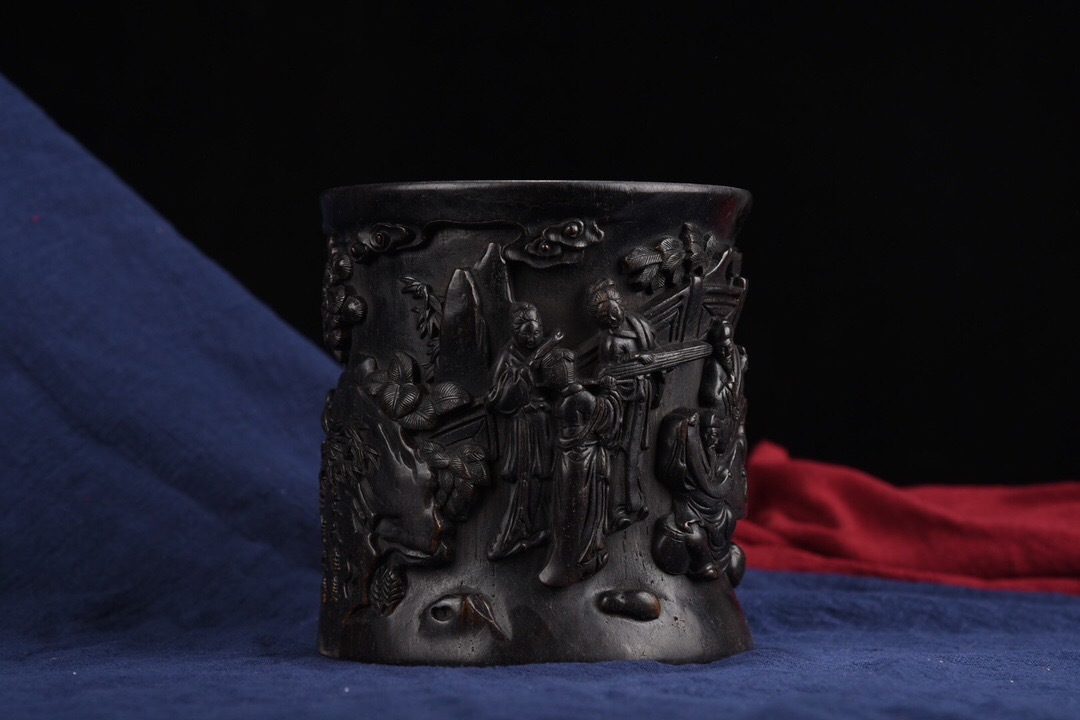 - ▽鴻▽ 烏木製 細密彫 文人雅集紋 筆筒 文房具 書道品 古賞物 中国古玩 中国古美術