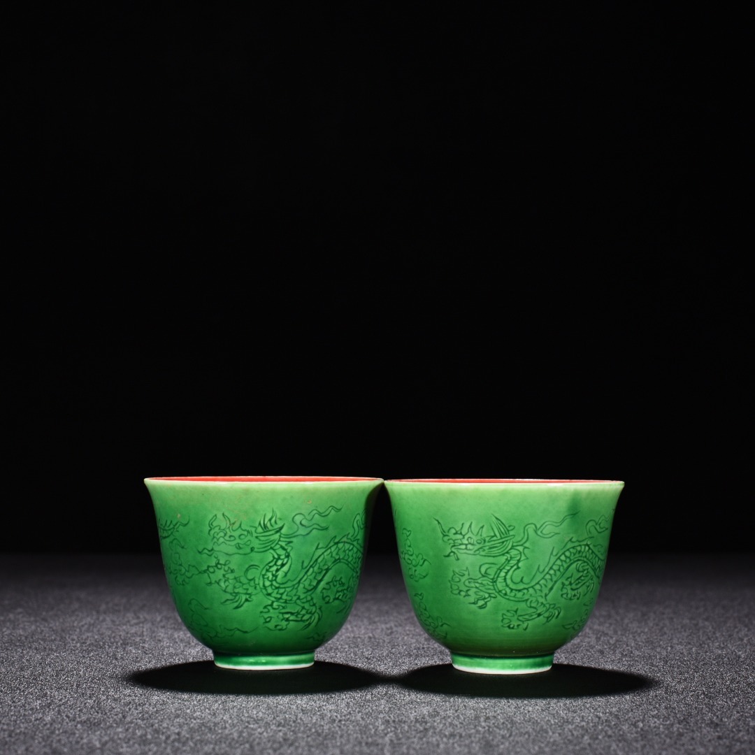- TA107■中国古玩 唐物 大明成化年制款 緑釉刻龍紋内紅釉杯一対 時代物 極上品■