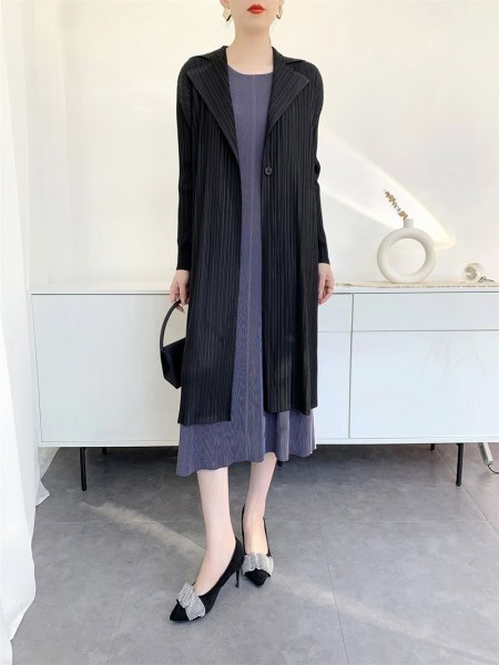 - 2504レディース pleatsプリーツコートロング丈肌触り弾力があり合わせ安いポケット付き ブラック