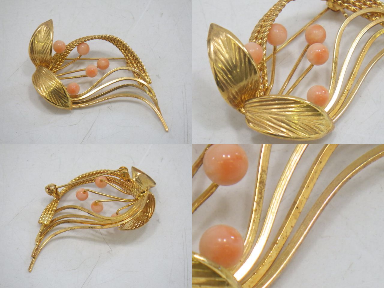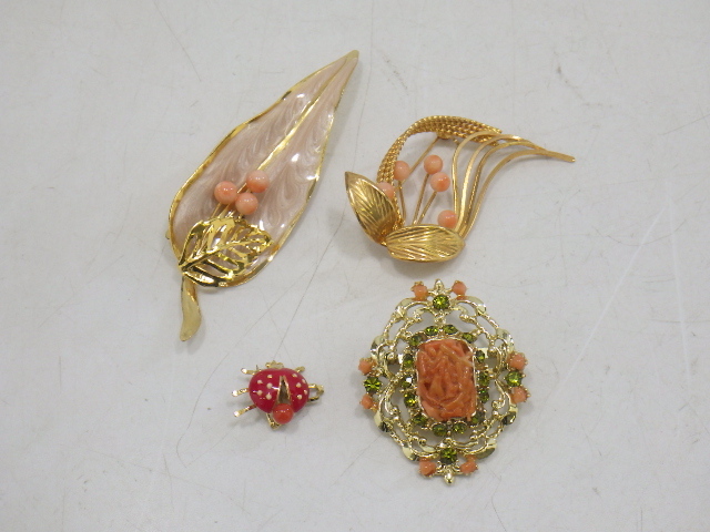 - h5D145Z- 珊瑚 サンゴ ブローチ ピンブローチ てんとう虫/リーフ エナメル/ペリドット風/果実モチーフ 計4点