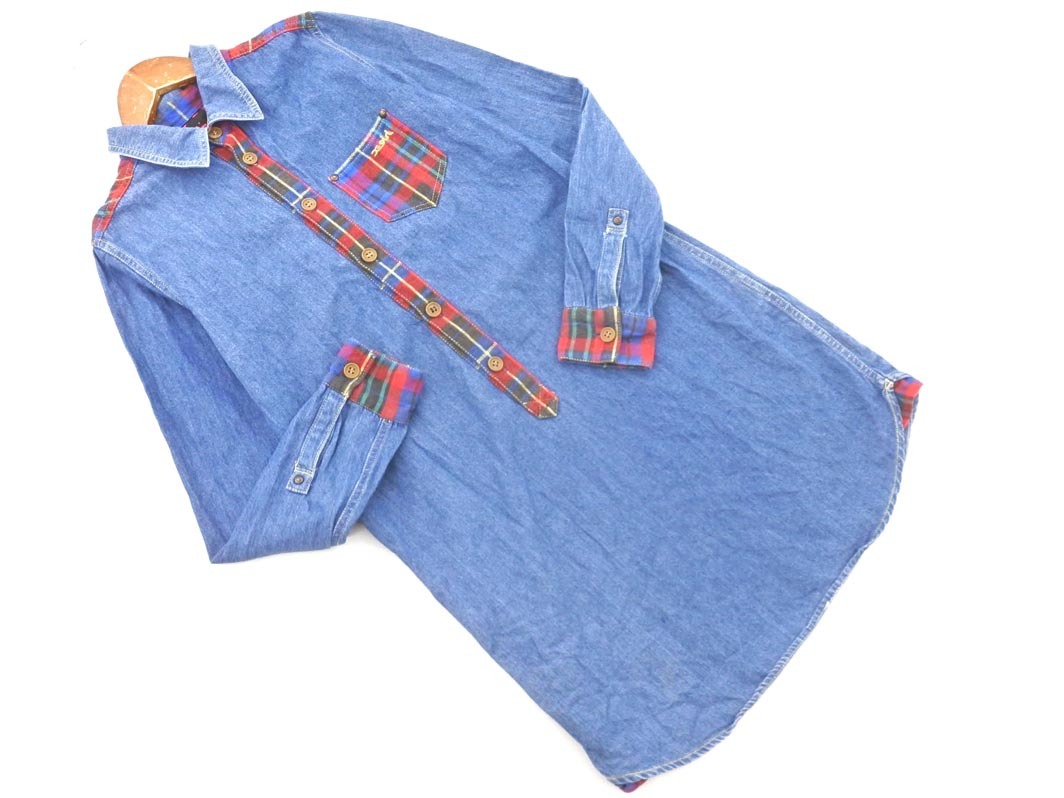 > X-girl エックスガール デニム チェック 切替 シャツ チュニック ワンピース size2/青 ■◇ ☆ fdc8 レディース