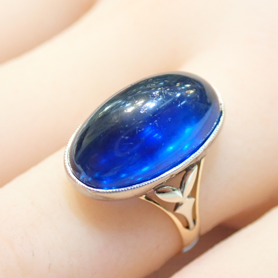 - ■K18 合成サファイアリング■覆輪留め ミル打ち 穴透かし■アンティーク 昭和レトロ■指輪■中古磨き仕上げ■