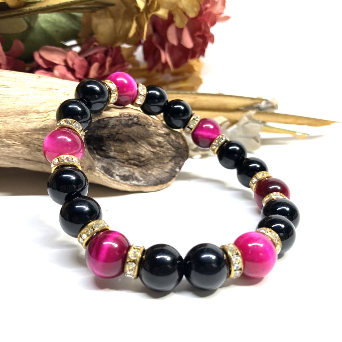 > モリオン&ピンクタイガーアイ パワーストーン ブレスレット 天然石ブレス (ゴールド) 10mm メンズ・レディース 厄除け 金運 ☆