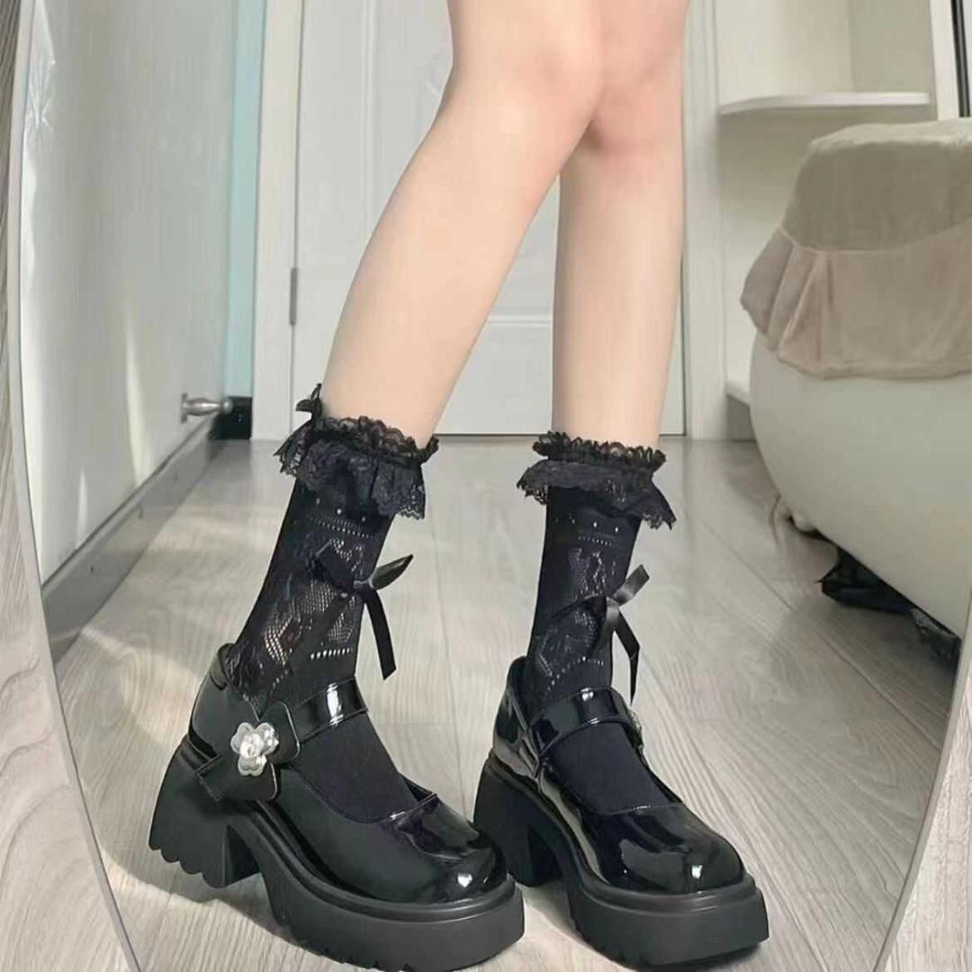- レース靴下 リボン ソックス シースルー ゴスロリ ロリータ 地雷系 黒ブラック
