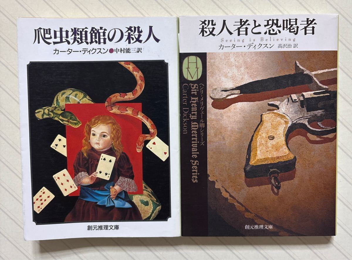 - 「爬虫類館の殺人」「殺人者と恐喝者」(ヘンリ・メリヴェール卿シリーズ)カーター・ディクスン/著 中村能三・高沢治/訳 創元推理文庫