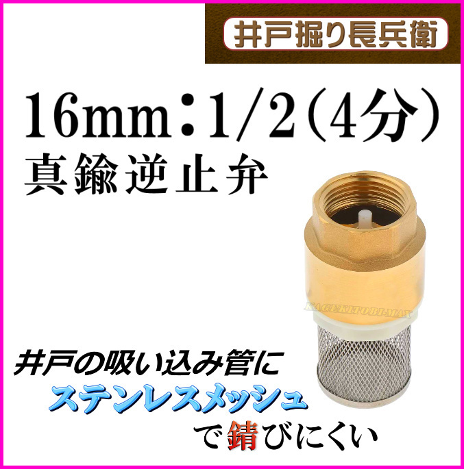 > 16mm 1/2 ( 4分 )真鍮製 逆流逆止弁 井戸に便利な ストレーナー付 チェックバルブ 井戸ポンプ 手押しポンプ 新品 フート弁 / 井戸堀り長兵