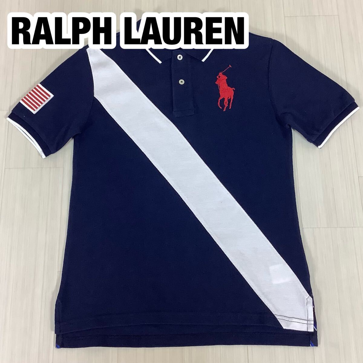 - 美品 POLO RALPH LAUREN ポロラルフローレン 半袖ポロシャツ ボーイズM ネイビー 切り替えし斜めライン 星条旗 ビッグポニー 鹿の子