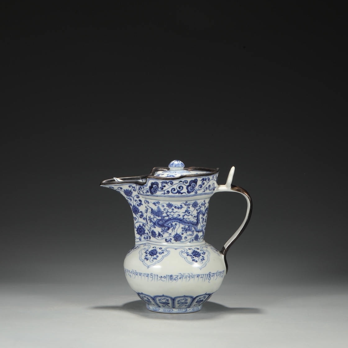 - 明 宣徳青花纏枝梵文龍紋銀口僧帽壺 高さ23.5㎝ 横幅24㎝ 口径14㎝ 唐物 箱付 陶磁器 古美術 置物 RG1024