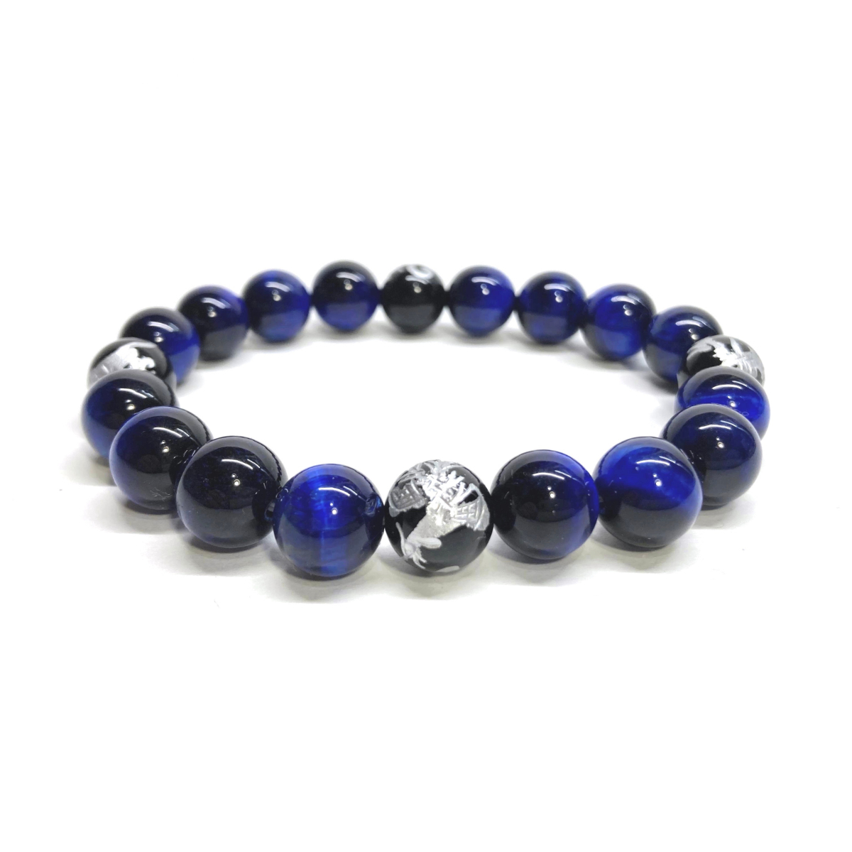 - 10mm 四神獣銀彫オニキス×ブルータイガーアイ パワーストーン ブレスレット天然石 運気上昇 開運 金運 恋愛運 青龍 白虎 玄武 朱雀 ☆