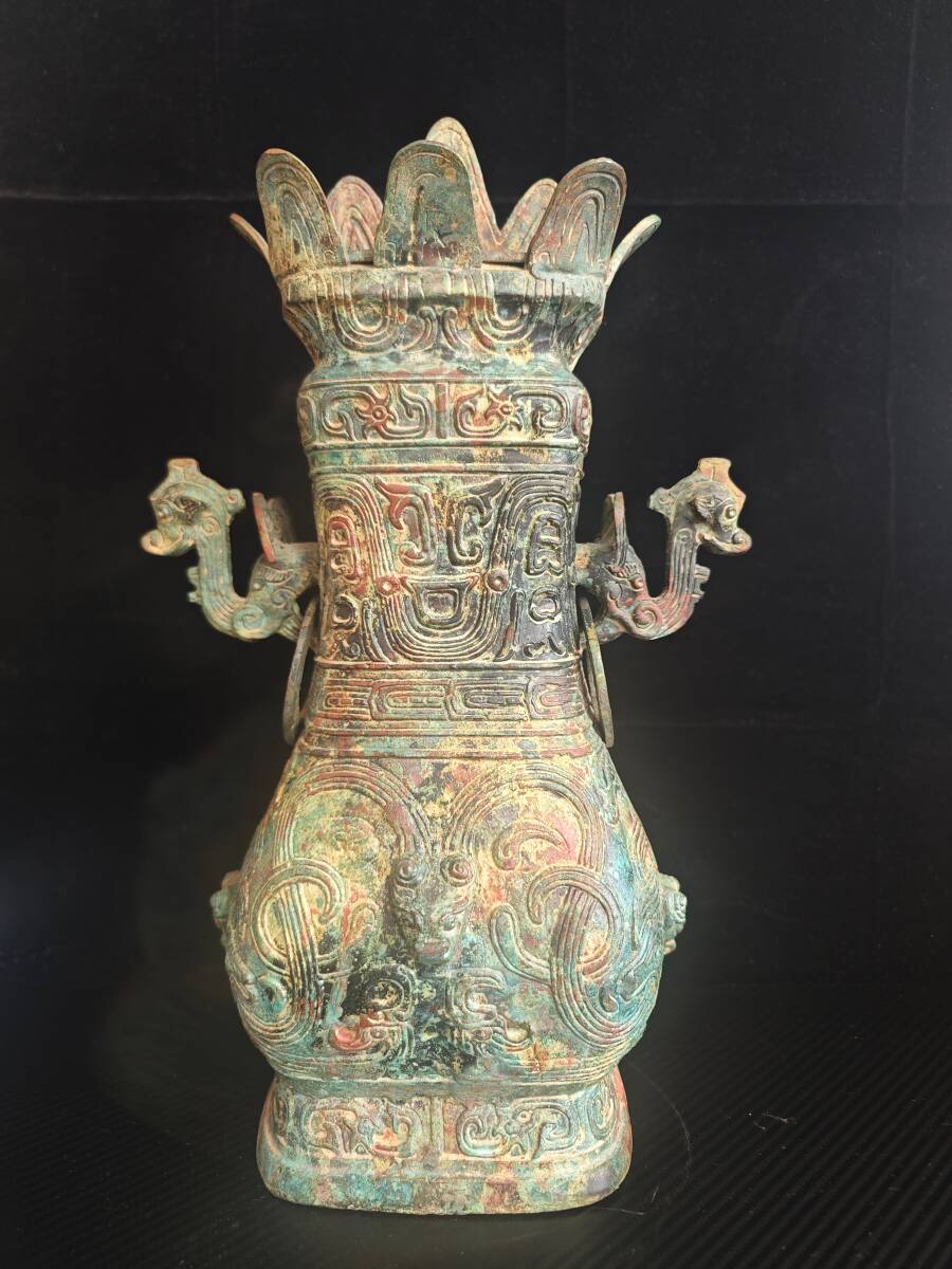 - V038 中国青銅器 龍紋方壺 酒器 時代物 高さ39cm/長さ23cm/幅14.5cm/重量3106g