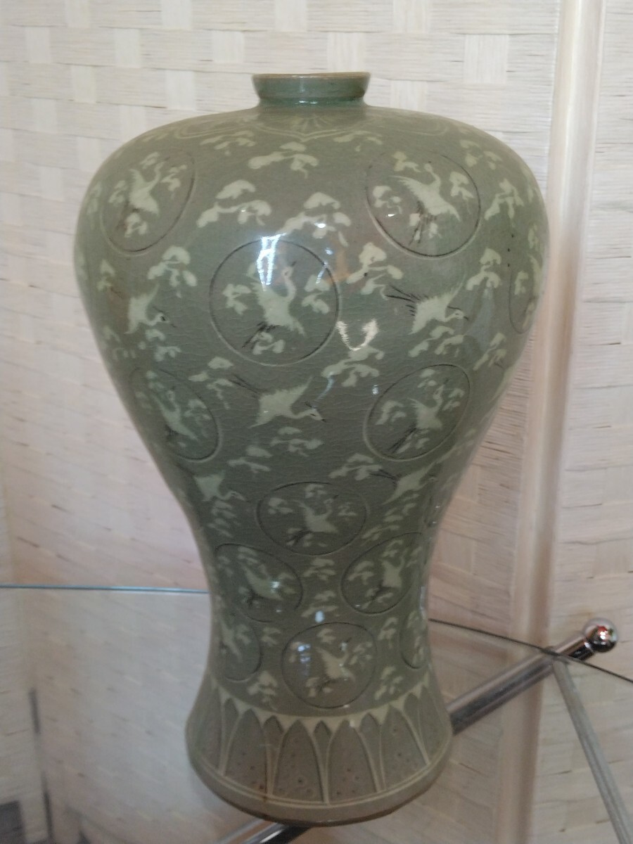 - 高麗青磁 壺 花器 志昔 鶴 柄 高さ30cm 口径4cm 保管品 花瓶