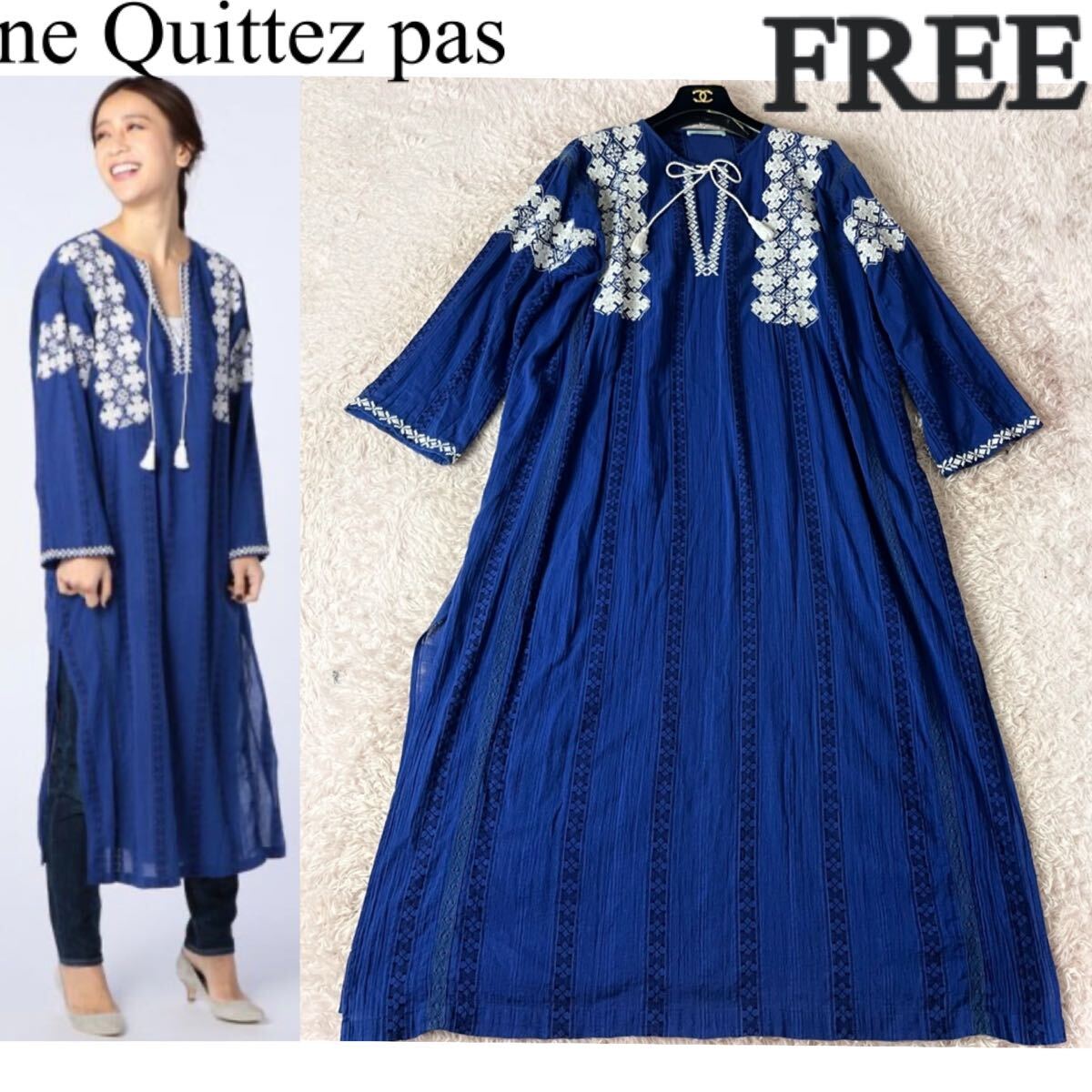 > ne Quittez pas ヌキテパ ヌキテバ ロングワンピース マキシ Aライン フレア 刺繍 花刺繍 花柄 レース リボン ブルー 青 フリーサイズ
