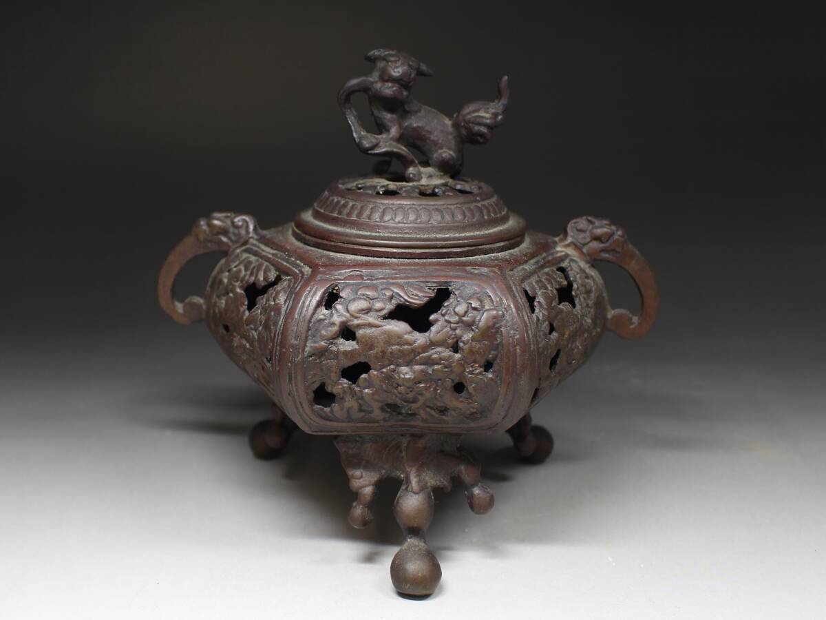 - ◆高岡銅器・三足香炉・獅子摘・象双耳・瓢箪脚・透かし彫・煎茶道具・香道具◆a6145h