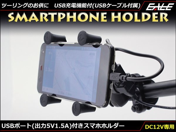 > USBポート付 スマートフォンホルダー スマホ充電可 5V1.5A ツーリングなどにナビとしてスマホなどの使用にお勧め S-339