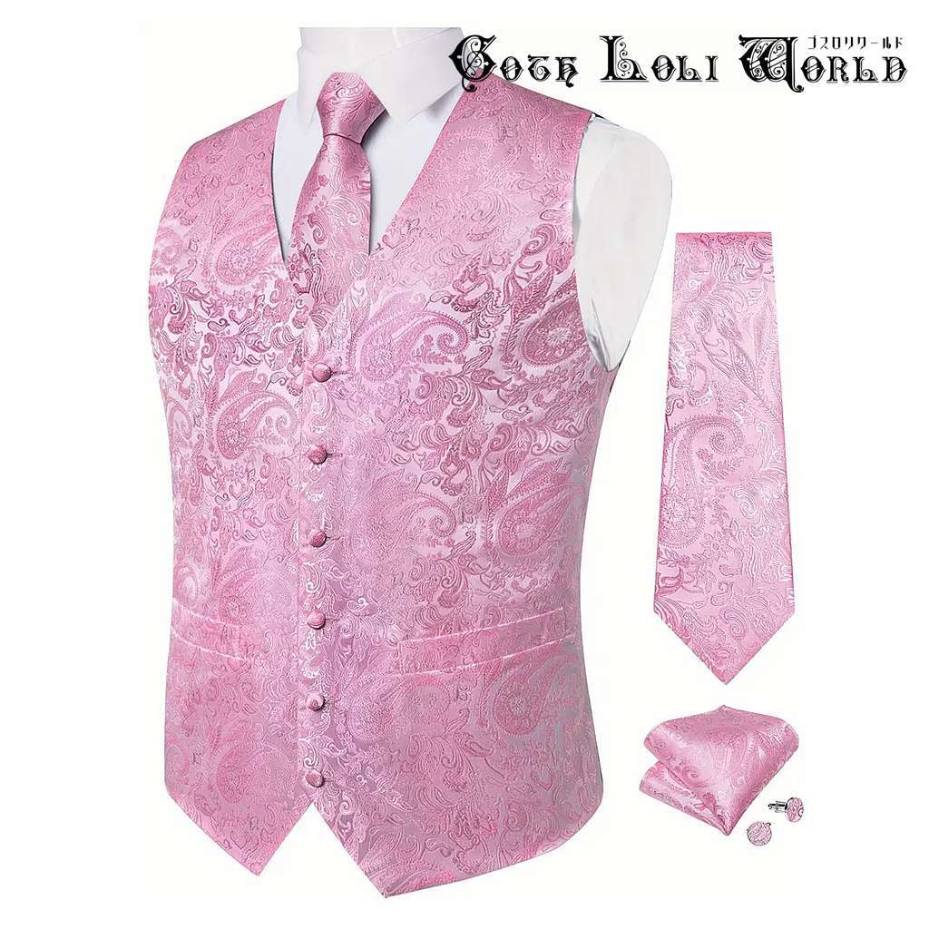 - 即納 WT012CE-S ベスト ネックタイ ハンカチ カフスボタン セット ピンク色 メンズファッション ジェントルマン 紳士 ジャガード ゴシック