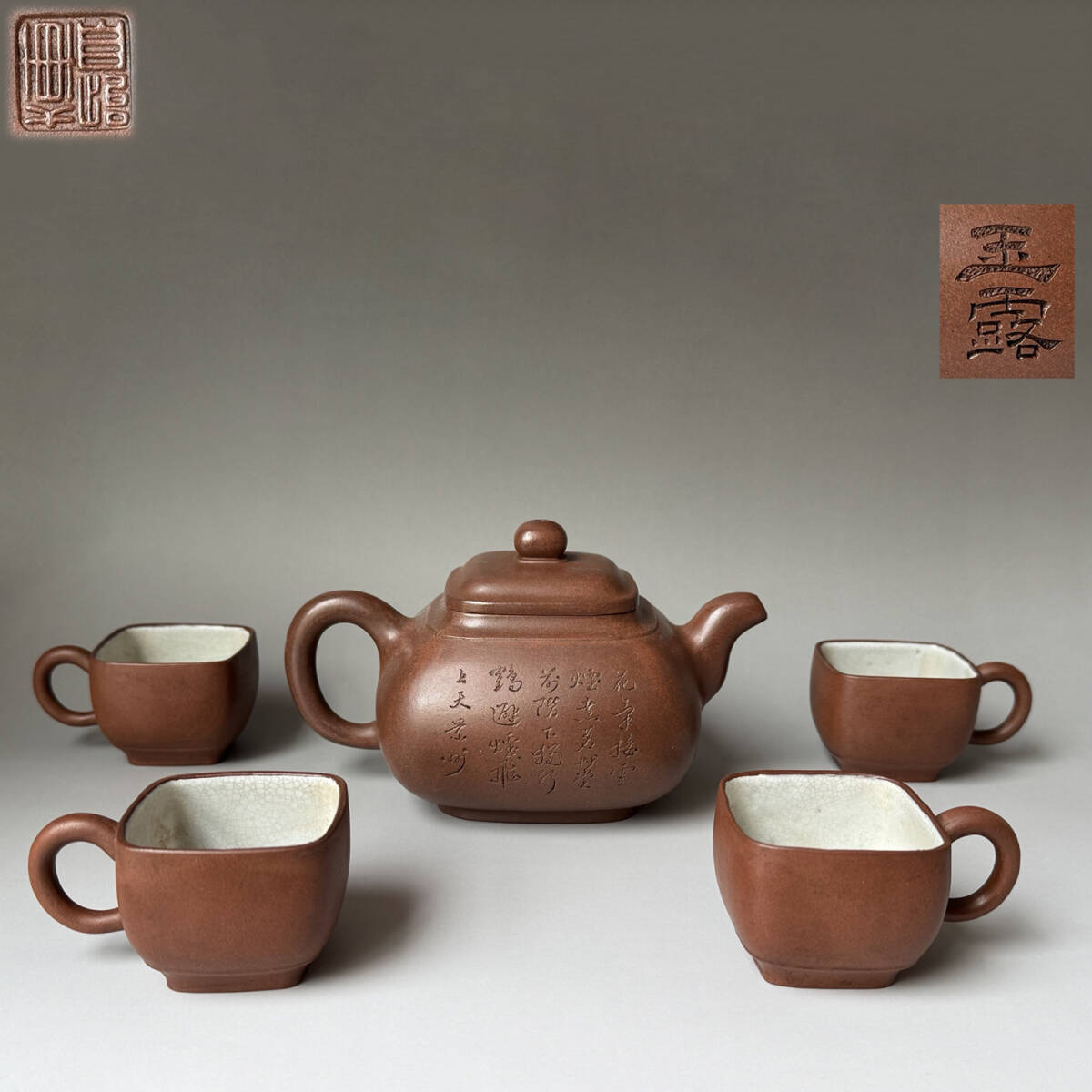 - 古陶芸 紫砂壷 近現代 【顧景洲】 製 「玉露壺5点セット」 朱泥 煎茶 急須 茶道具 唐物 時代物 茶器 容量480cc LT-250510