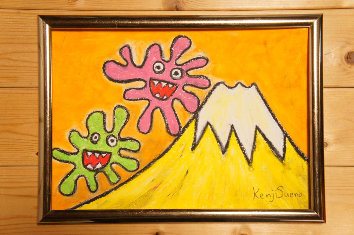 > 【アメーバくんと富士山】手描き 肉筆 クレヨン画 絵画 A4サイズ 766,Crayon painting, oil pastel painting, original art