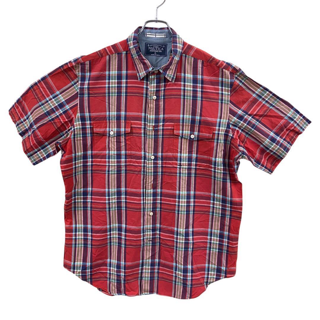 - ノーティカ メンズ半袖チェックシャツ ポケット 赤系 L 綿100%【3897】