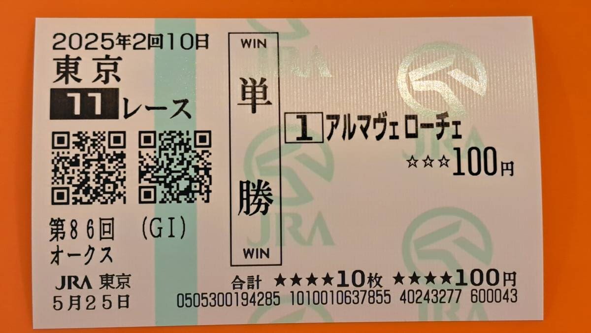 - 第86回優駿牝馬オークス アルマヴェロー 現地単勝馬券
