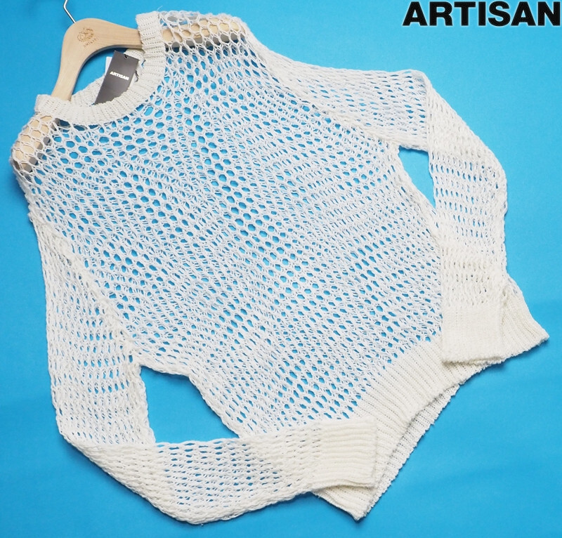 > 新品展示品定価3.6万円 ARTISAN アルチザン 日本製 麻100% 透かし編み クルーネックニットF白(01) 34KY04