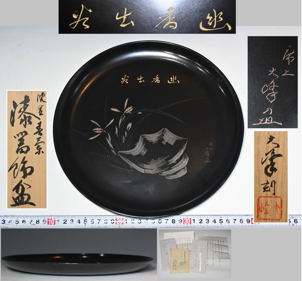 > 真贋保証■輪島塗 沈金 人間国宝 前大峰 刻■ 岩に蘭 漆器飾盆 径約29.8cm 共箱・手紙付 輪島市名誉市民 飾皿 丸盆 木製漆器 漆芸 黒漆塗