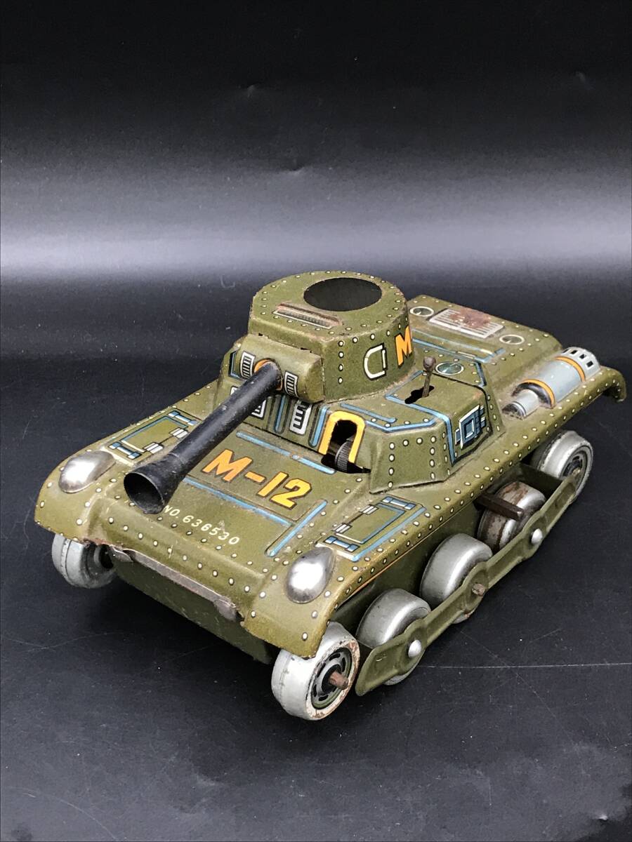 - 0527-02◆増田屋 マスダヤ ブリキ 戦車 M-12 ゼンマイなし 現状品 重みあり 約18.5cm 昭和レトロ 当時物 ビンテージ おもちゃ