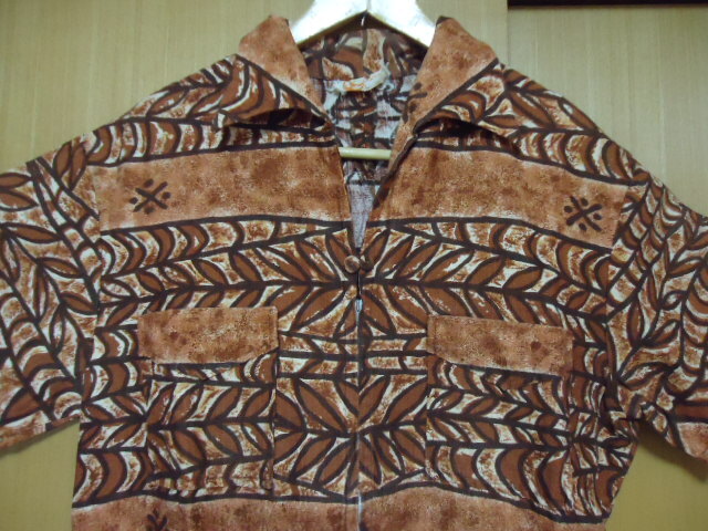 - 即決 ハワイ IOLANI イオラニ ヴィンテージ アロハシャツ こげ茶・茶色 葉っぱ・他柄 M フロントジッパー 珍品
