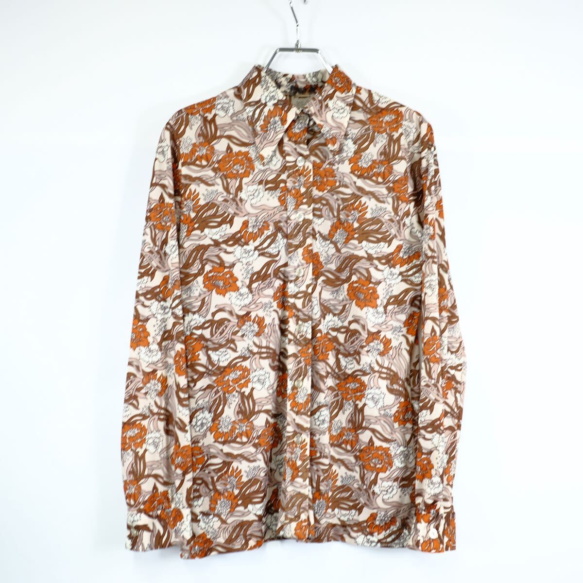 - 1970s ビンテージ 総柄ポリシャツ 花柄 クラシック デザイン アート USA製 古着屋 ブラウン 茶色 ウエスタン 長袖