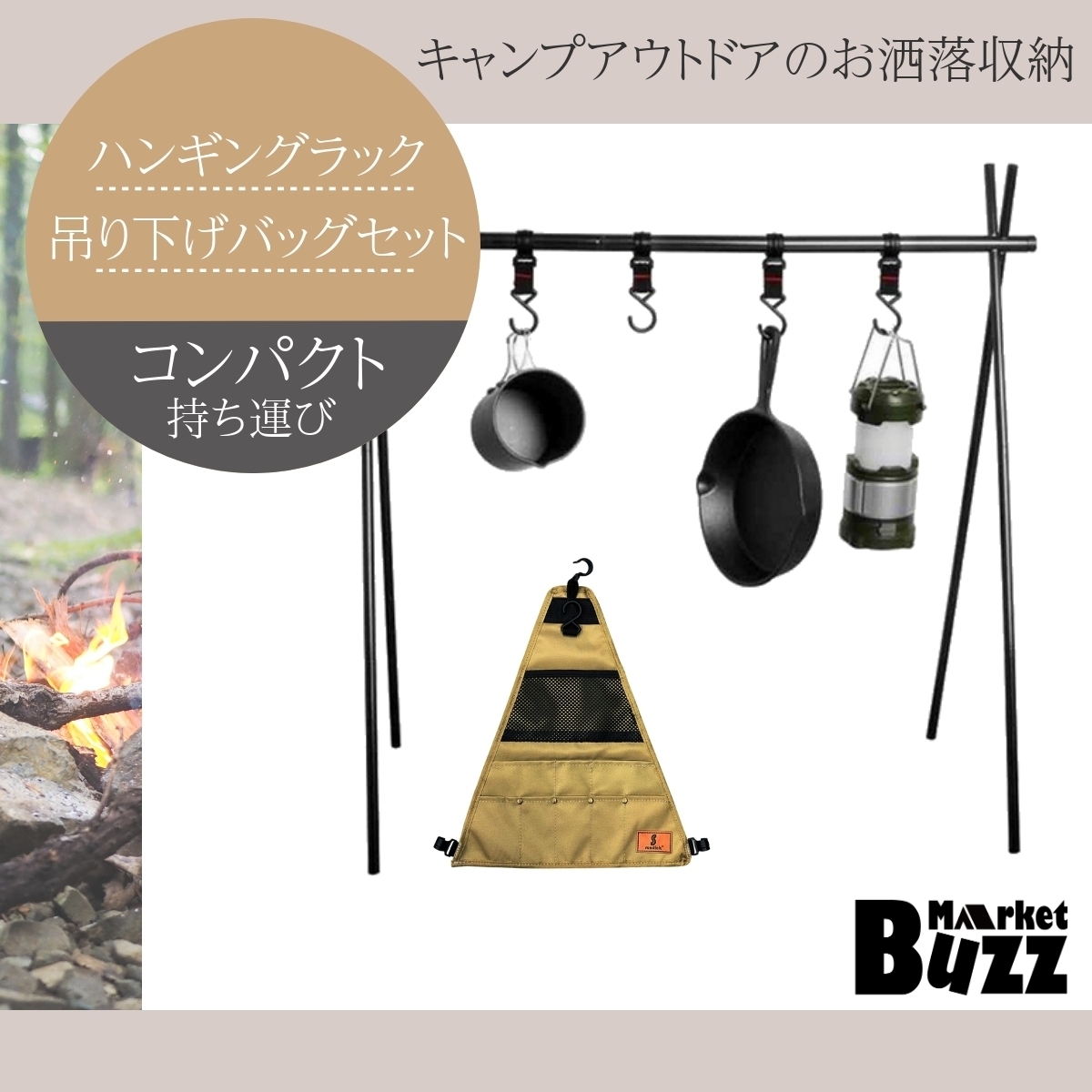 - アウトドアハンガーラック & 吊り下げ型 収納バッグ 三角 2点セット 登山 キャンプ ハイキング アウトドア に